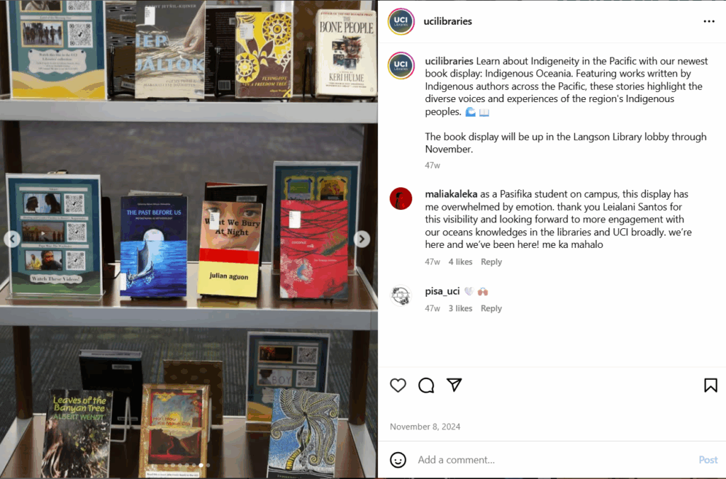 Our biggest takeaway from this project is that the school community is more than willing (and excited) to contribute to library spaces. By having students, staff, and faculty contribute to our collection, we are able to build rapport with our patrons and better reflect their experiences. UCI is a federally designated Asian American and Native American Pacific Islander-Serving Institution (AANAPISI), but many could argue that there has been little-to-no representation of its Indigenous student body. As library professionals, we believe that it is crucial for us to uplift diversity, rather than be complicit in erasure. We hope that this project, along with the APALA Literature Awards criteria changes, sheds light on Pacific Island voices and experiences.