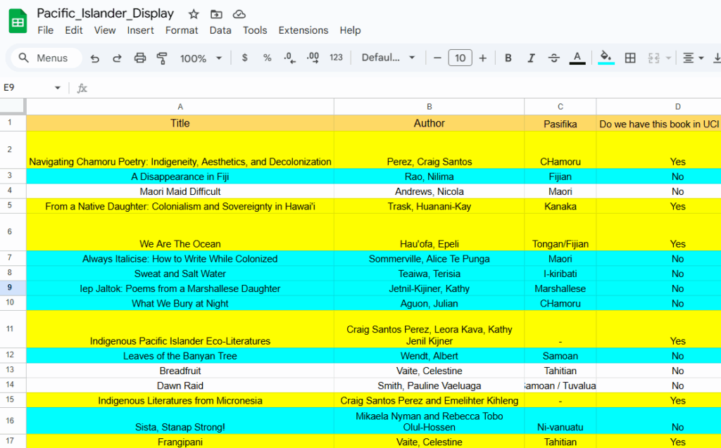 The challenge came early on, as we realized that the library had not collected many recently published books by authors from Pasifika backgrounds. In addition to consulting websites such as Pacific Islanders in Publishing, we decided to seek input from other organizations on campus. We set up a Google Sheet and shared its access with the Pacific Islander Student Association (PISA) and fellow Pacific Islander staff and faculty, so they could list books they personally would like to see in our collection.